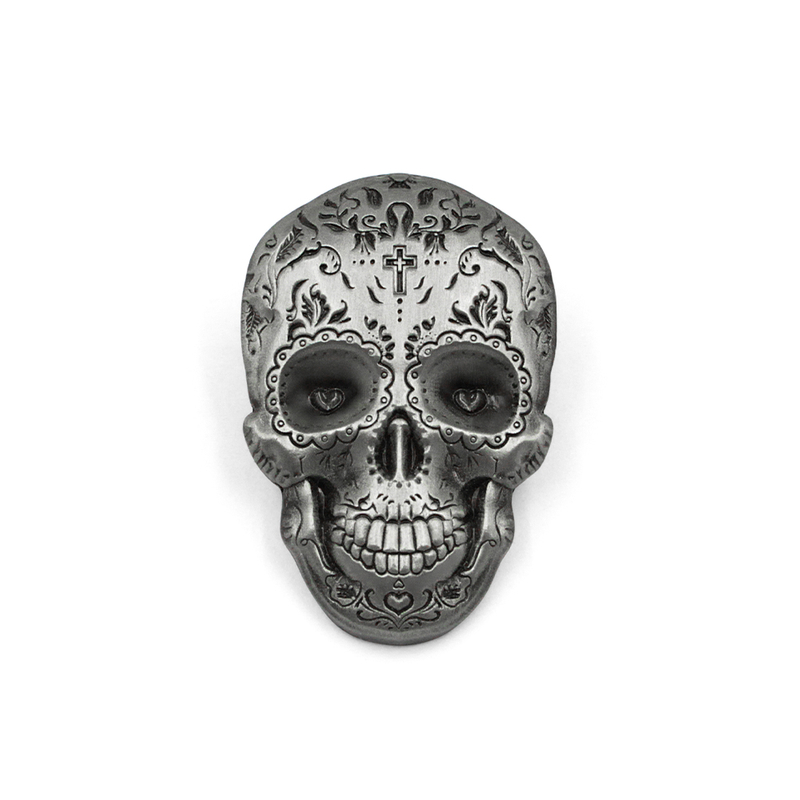 Close-up of an antiqued silver die cut metal pin featuring a detailed sugar skull design. The pin shows intricate floral engravings, heart-shaped eyes, and a cross on the forehead with a 3D relief effect Close-up of an antiqued silver die cut metal pin featuring a detailed sugar skull design. The pin shows intricate floral engravings, heart-shaped eyes, and a cross on the forehead with a 3D relief effect