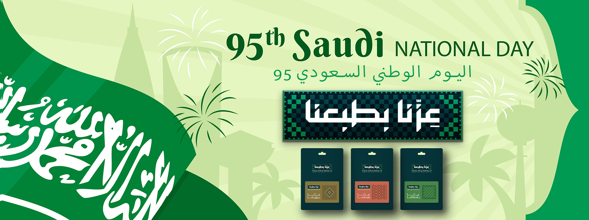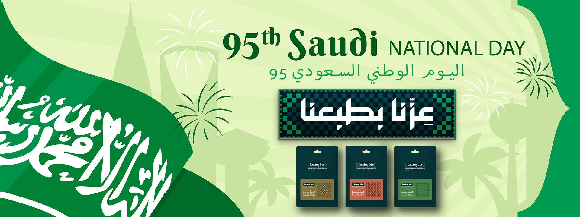 The slogan for Saudi National Day 95, on September 23, 2025, is "Our Pride is in Our Nature" (عزّنا بطبعنا). The slogan embodies 95 years of national pride and glory, reflecting the deeply rooted values in the nature and identity of the Saudi people.